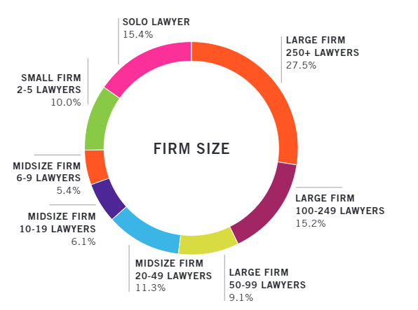 Private practice 70.2%, In-House Counsel 13.4%, Government 4.5%, Legal Education 4.5%, Judiciary 1.0%, Other 6.4%